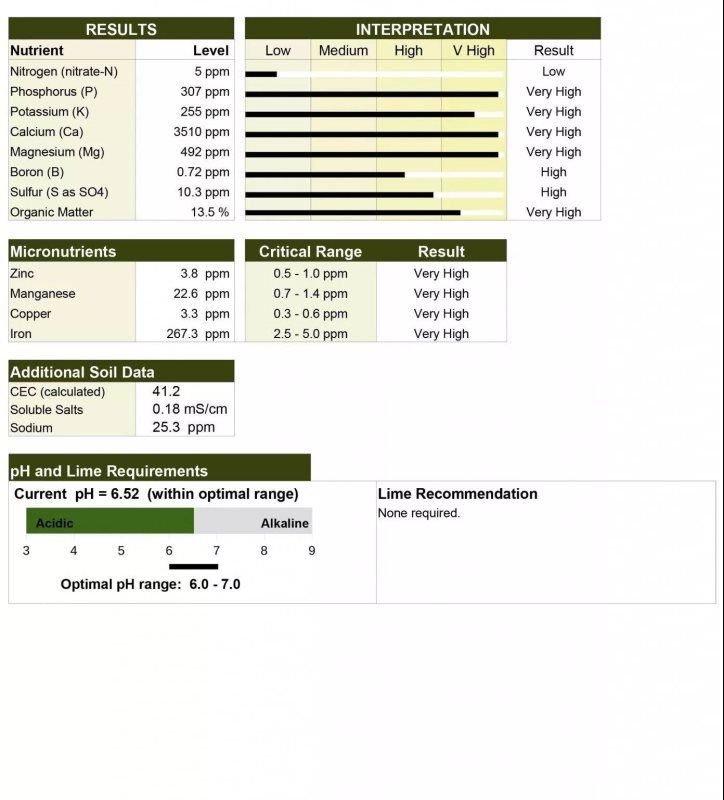 This Soil Report shows that there are adequate levels of nutrients in the soil as well as relative proportions of them to each other. There is a high level of organic matter, which not only reduces the need to water so frequently, but makes the soil environment more hospitable to microbial communities. These microbial communities help plants absorb nutrients and act as the plant’s immune system.