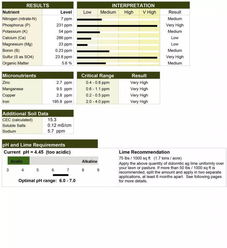 The Nitrogen level is very low, but that is typical. Nitrogen is a relatively volatile nutrient and can also be difficult to measure. No need to worry – all of our treatments include Nitrogen since it is the nutrient used in the largest quantities by plants.