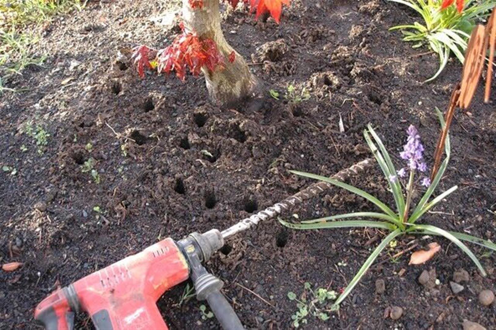 After drilling we apply a mixture of our probiotic FertileTea, Actinovate (a bio-fungicide), Azomite (a complete mineral product), as well as humic acids, sea kelp, and mycorrhizal fungi. The solution is poured into the root zone of trees and shrubs, allowing it to penetrate the earth through the cored holes, reaching the roots.